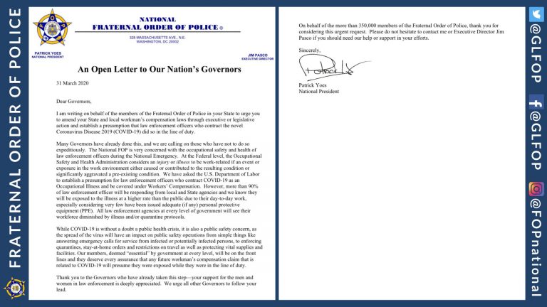 Brothers and Sisters, National FOP President Patrick Yoes has written to all of our Nation’s Governors urging them to amend State and local workman’s compensation laws through executive or legislative action and establish a presumption that law enforcement officers who…